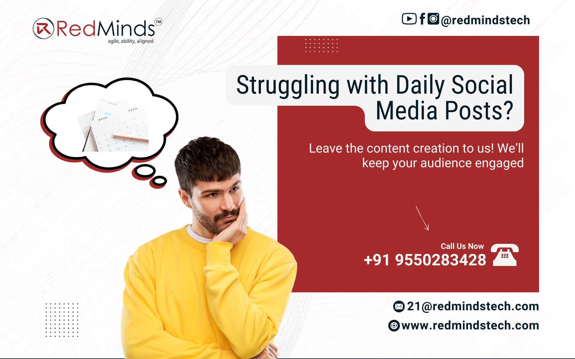 Stop struggling with daily posts and start enjoying the benefits of a seamless social media strategy. Whether you need a monthly content calendar, eye-catching visuals, or just someone to take the reins, RedMinds Tech has you covered.